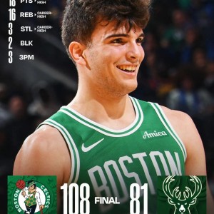常规赛,凯尔特人客场108-81战胜雄鹿。这场比赛,杰伦布朗缺席,新秀雨果-冈萨雷斯顶上了首发,然后打出了生涯之夜:全场...